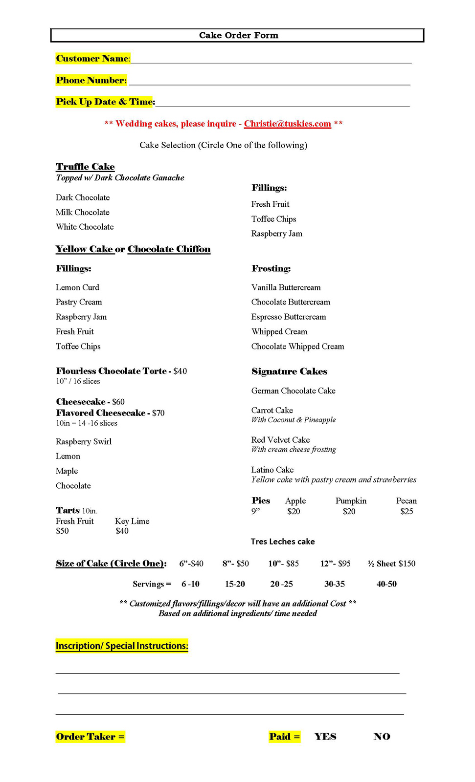 NOTE: All WEDDING cake orders should be sent to Christie@tuskies.com